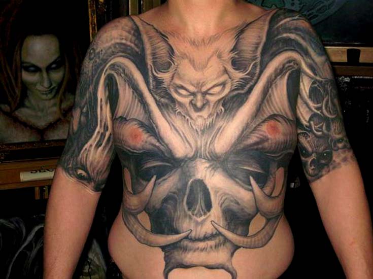Human Skull With Bat Wings Full Chest Tattoo Amazing